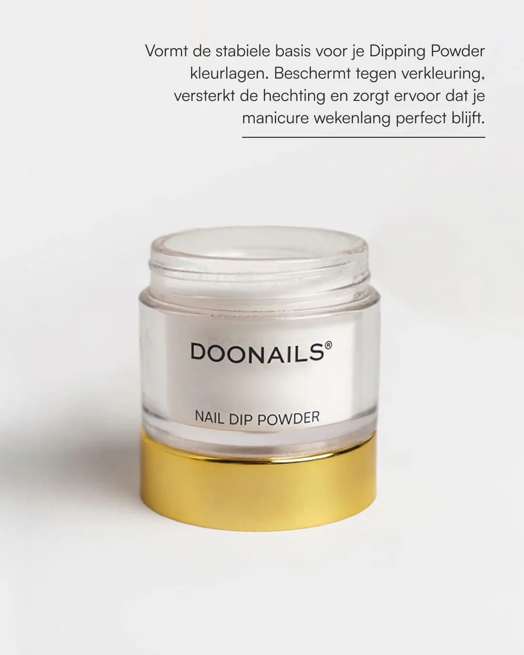 De Doonails Base Powder is een onmisbaar onderdeel van elke Dipping Powder manicure. Als eerste poederlaag zorgt het voor een stevige basis waarop de kleur perfect hecht. In combinatie met de Base Coat beschermt het je natuurlijke nagel betrouwbaar tegen verkleuringen en afbrokkelen, waardoor je manicure extra lang meegaat. De wit-transparante textuur verdeelt zich gelijkmatig over de nagel.