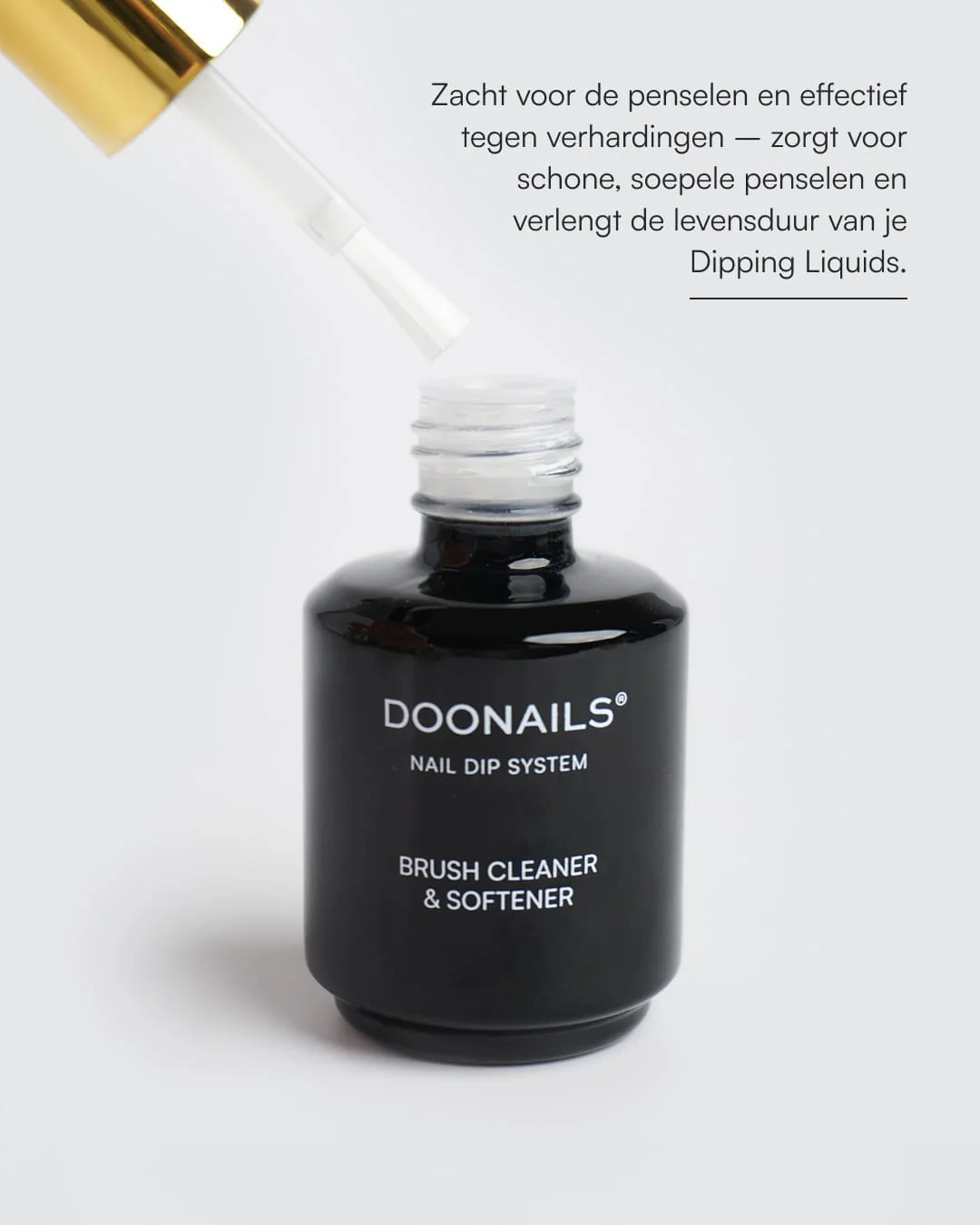De Doonails Brush Cleaner & Softener – voorheen bekend als Brush Saver – is een onmisbaar product om je Dipping Powder Liquids te beschermen tegen uitdroging, verharding of verkleuring. Hij verwijdert effectief resten van Base Coat, Top Coat of Activator en maakt zelfs uitgeharde kwastjes weer zacht en bruikbaar.